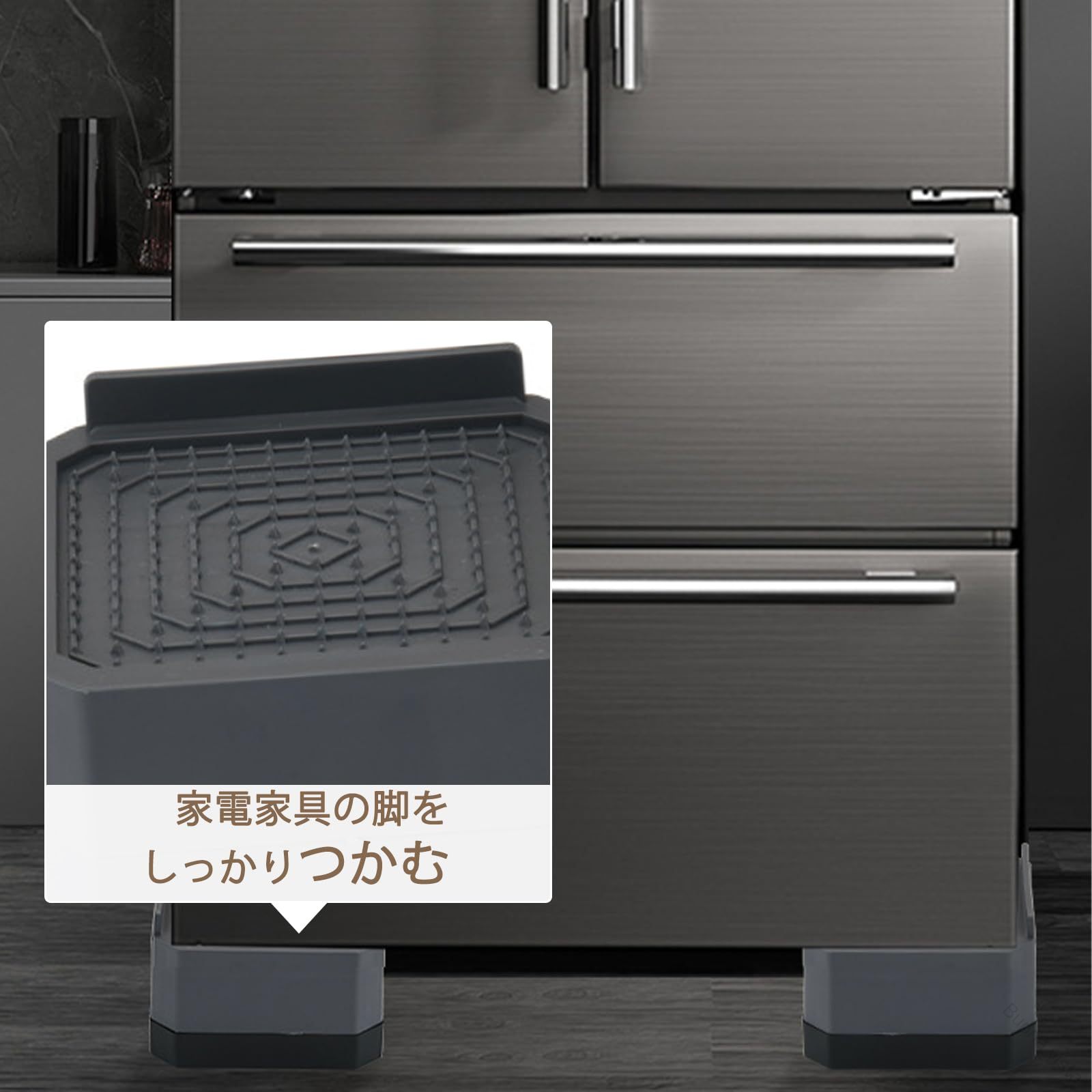 適用対象が多い!置くだけ簡単!洗濯機の振動が防げることができます。底はゴムで大気圧吸着がより強固になります。大気圧吸着で接触面が大きくなり滑り止めがしっかりします。家具の背を高めて掃除に便利。ベッド、テーブル、ソファー、デスク、キャビネットなどほとんどの家具に対応します。突き二重滑り止め設計滑り止めで周りが外れにくいです。内のグリッド構造とゴム材質は特有な防振性があるので、床に伝える洗濯機の揺れや異音をやわらげてくれます。上段と中段はPP(ポリプロピレン)の素材で、頑丈的で耐久性が抜群です。下段幅広くてしっかりしていて倒れにくいです。家電や家具をかさ上げし、モップ・クイックルワイパー・ロボット掃除機が入るのでホコリ取りには問題ないです。さらに、ベッド・ソファーを上げたら収納スペースを拡大することもできますよ。