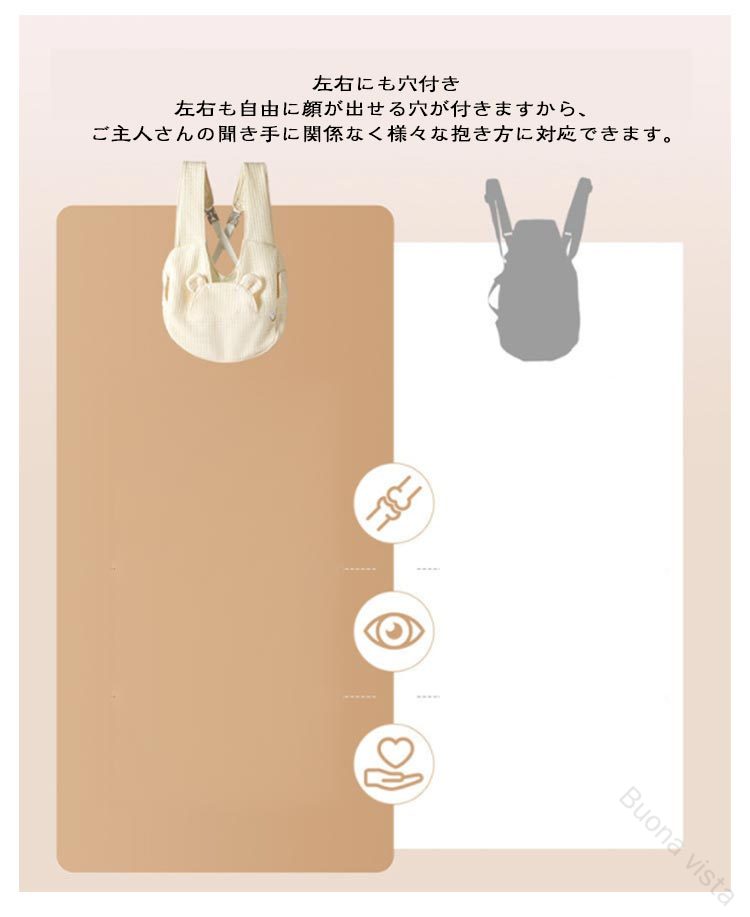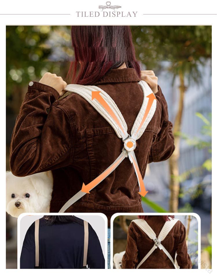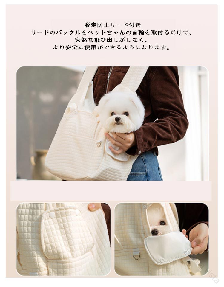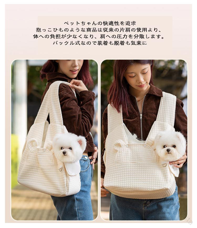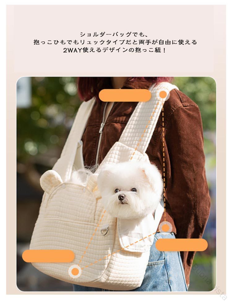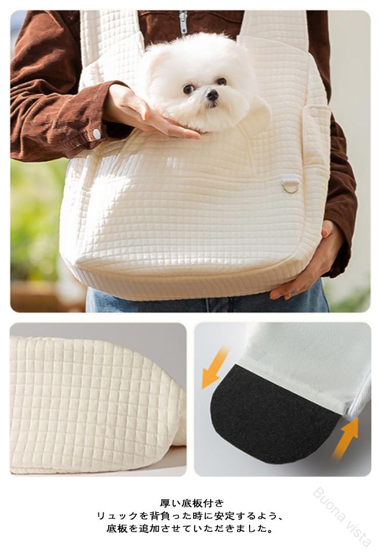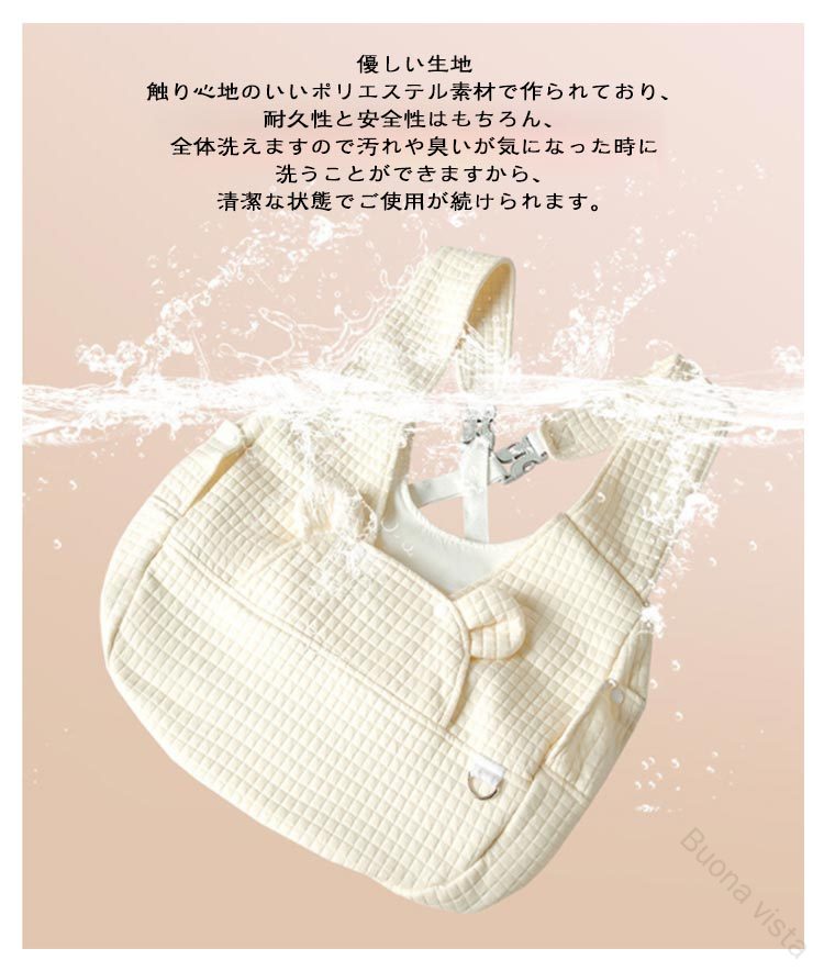 ペットスリング飛び出し防止2WAYショルダーバッグでも、抱っこひもでもリュックタイプだと両手が自由に使える2WAY使えるデザインの抱っこ紐!脱走防止リード付きリードのバックルをペットちゃんの首輪を取付るだけで、突然な飛び出しがしなく、より安全な使用ができるようになります。ちょっとしたお買い物や電車ヤバスなどに乗せる時に便利で、ペットが苦手な乗客も安心です。調節機能付きワンバックル肩ひもの長さは使用者の体型や身長に合わせて調節することができます。肩掛け部分の幅は広めのデザインなので。愛犬を入れたときに重さを感じにくく、安定感がある作りとなっています。ペットちゃんの快適性を追求抱っこひものような商品は従来の片肩の使用より、体への負担が少なくなり、肩への圧力を分散します。バックル式なので装着も脱着も気楽に♪厚い底板付きリュックを背負った時に安定するよう、底板を追加させていただきました。底板が付属しており、犬用スリングの底面をしっかり支えて安定性抜群です。取り外してお手入れが簡単、いつでも清潔な状態で大切なワンちゃんとのお出かけが楽しめます。※洗濯前に底板を取り外してください。左右にも穴付き左右も自由に顔が出せる穴が付きますから、ご主人さんの聞き手に関係なく様々な抱き方に対応できます。ワンちゃんが入れても息苦しくならないように通気性はしっかり確保できます。ワンちゃんが不安になる時に、ご主人さんの顔を見ると落ち着くようになるでしょう。優しい生地触り心地のいいポリエステル素材で作られており、耐久性と安全性はもちろん、全体洗えますので汚れや臭いが気になった時に洗うことができますから、清潔な状態でご使用が続けられます。使わない時は、薄く畳んで収納可能です