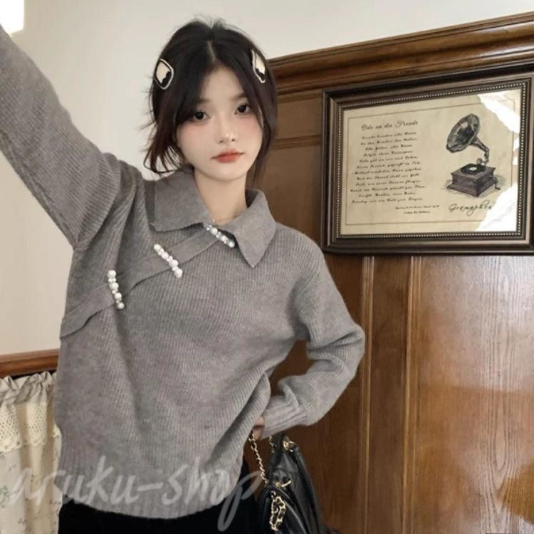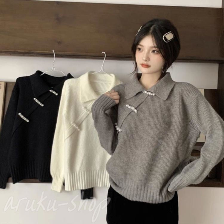 ニット 長袖 ニットトップス チャイナ レディースファッション 豊富な品揃え グレー ブラック ホワイト S M L XL 2XL