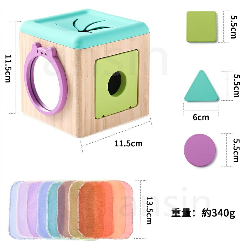 【完璧なティッシュボックスおもちゃ】このティッシュボックスおもちゃには木製のティッシュボックス、3つの形のブロック、8枚のスカーフが含まれています。スカーフは非常に柔らかく、結ぶことができ、引きやすくなっています。このおもちゃは赤ちゃんを引きつけ、一緒に成長させます。