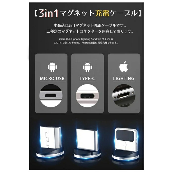限定299円 急速充電 マグネット 充 スマートフォン タブレット用ケーブル 変換アダプター 続々入荷中 Lighting コネクタ MicroUSB コネクタ タイプC コネクタ 3IN 1セット 1Mケーブル(ブラック) 1Mケーブル(レッド) 1Mケーブル(シルバー) 1Mケーブル(ゴールド) 2Mケーブル(ブラック) 2Mケーブル(レッド) 2Mケーブル(シルバー) 2Mケーブル(ゴールド)