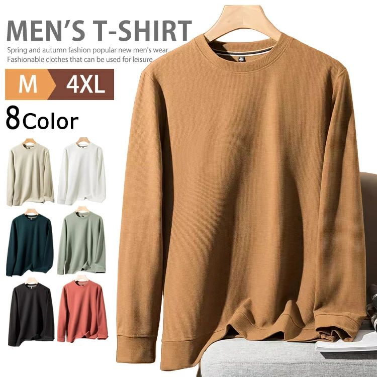 ワッフル ロンT メンズ 無地 長袖 長袖Tシャツ クルーネック ロンティー ティーシャツ カットソー サーマルTシャツ ロングTシャツ カジュアル トップス プルオーバー メンズTシャツ インナー