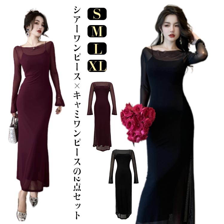 シアーワンピース シースルー シースルーワンピース タイトワンピース 透け感 ドレス フェミニン タイト シアートップス キャミワンピース ロング キャミ セ ワンピース