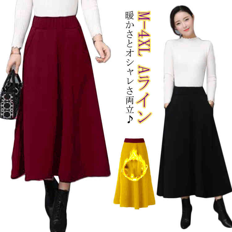 裏起毛 ミモレ丈 フレアスカート あったか Aライン ロングスカート ふかふか マキシスカート 裏ボア 体型カバー 大きいサイズ レディース ウェストゴム スカート ポケット付き