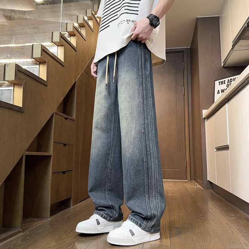 デニムパンツ メンズ 学生 ストレート ハイウエスト ルーズ ワイドレッグ ロング 黒 ベージュ ブルー 春秋 韓国 トレンド ゆったり 通学 普段使い ズボン 青少年 潮流 ジーンズ