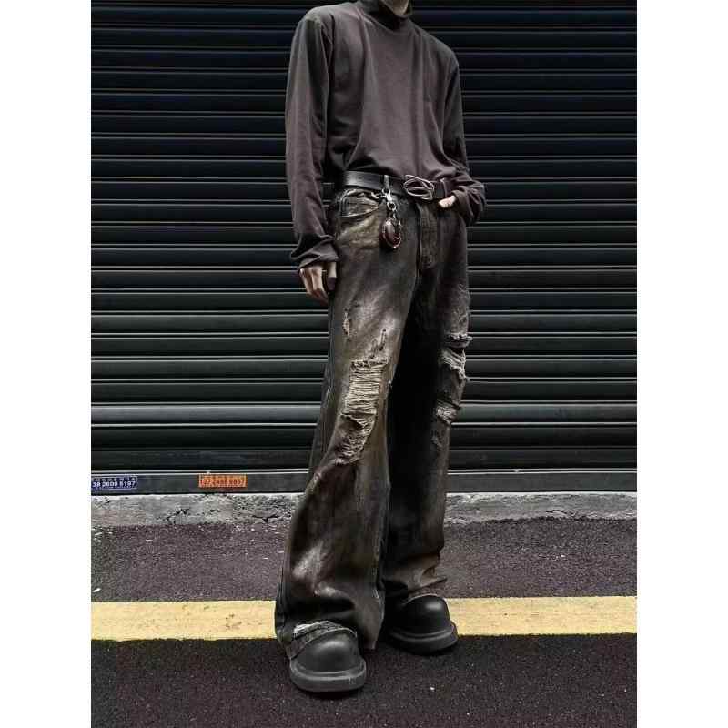 デニムパンツ メンズ ダメージ加工 ユーズド加工 ダーティーウォッシュ 泥染め ワイドストレート ルーズフィット ストリート コットン ストレッチ アメリカンヴィンテージ