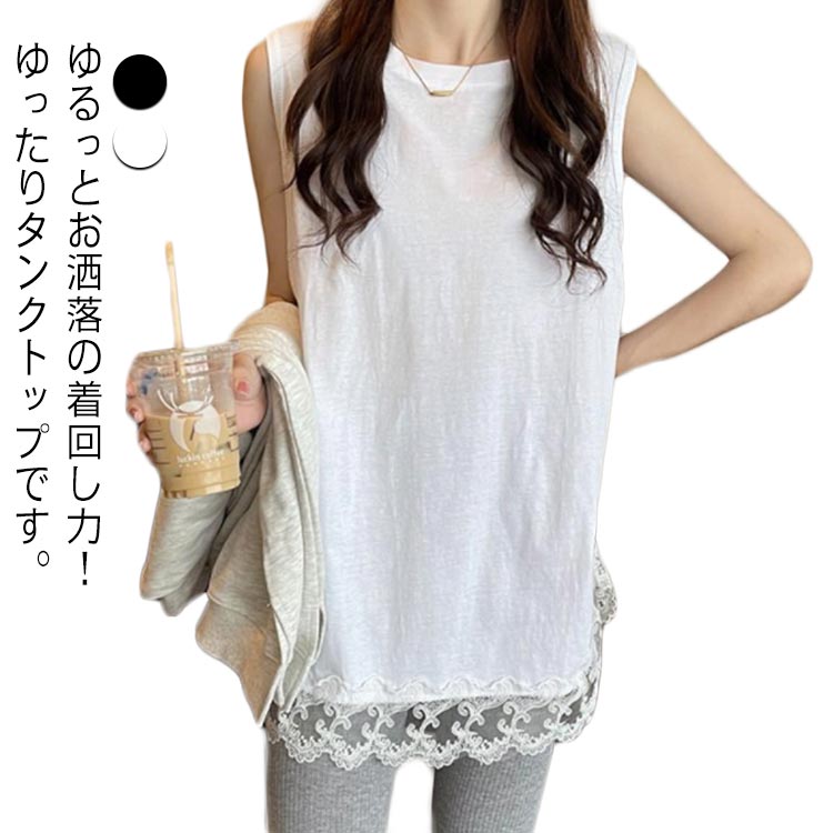 裾レース タンクトップ ロング丈 ノースリーブ トップス レディース レイヤードタンクトップ インナー 重ね着 大きいサイズ ロングタンクトップ 春 夏 秋 お尻が隠れる きれいめ L XL 2X M