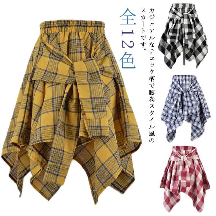 ウエストゴム スカート ミニ 全12色 レイヤード 付け裾 不規則 チェック柄 シャツスカート レディース シャツ腰巻き風スカート