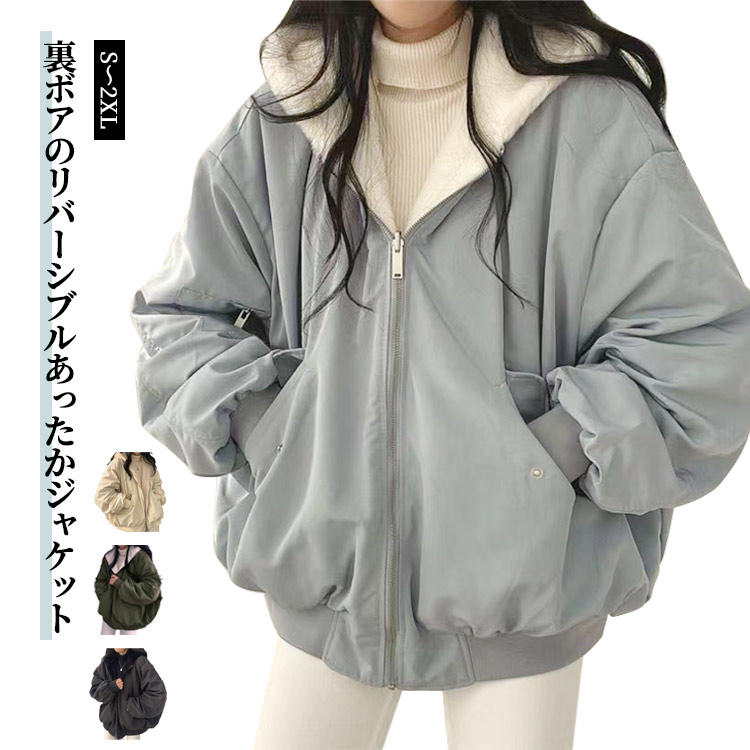 裏ボア 中綿ブルゾン 厚手 防寒 スタンドカラー ジャケット ボアジャケット レディース 中綿ジャケット カジュアル おしゃれ 通学 あたっか オーバーサイズ ゆった リバーシブル