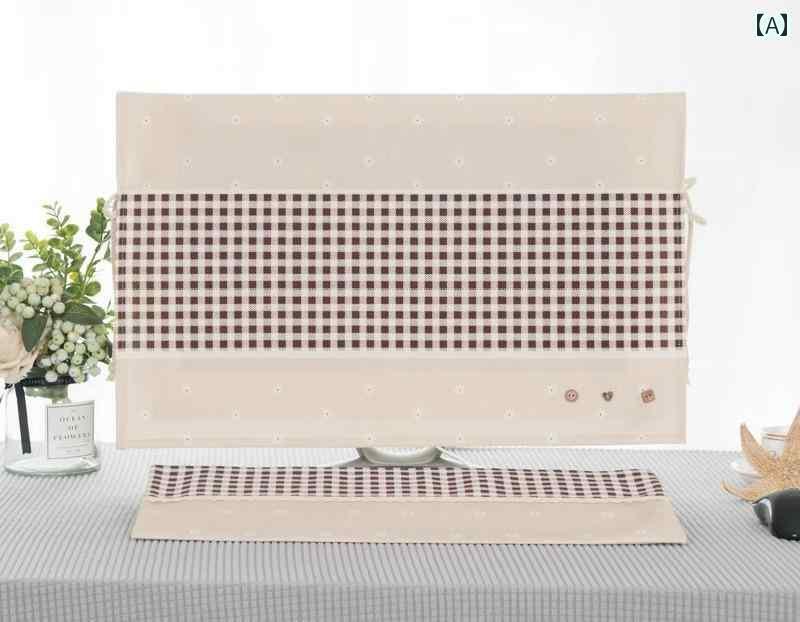 パソコン モニター カバー ほこりよけ ディスプレイ PC デスクトップ 汚れ防止 保護 防塵 キーボード セット 布 クロス 綿麻 ボタン シンプル かわいい 紐 チェック