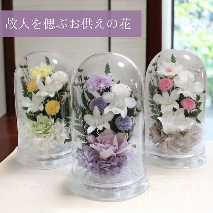 仏花 プリザーブドフラワー お供え お花 お悔やみ お彼岸 仏壇 枯れない 花 お盆 新盆 ペットブリザードフラワー 仏花ドーム はづき 初盆