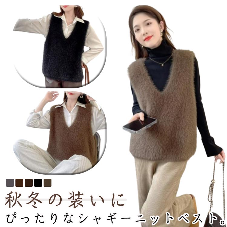 シャギー ベスト レディース ファーベスト もこもこ 秋冬 vネック ニットベスト レイヤード シャギーニット トップス 毛足長め フェイクファー 冬 セーター ノースリーブ お プルオーバー