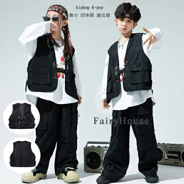 黒ベスト キッズ ダンス 衣装 ベスト 男の子 女の子 かっこいい おしゃれ 長ズボン カジュアル ヒップホップ ジャズダンス 韓国 k-pop 発表会 団体服 ステージ着 hipho 応援団