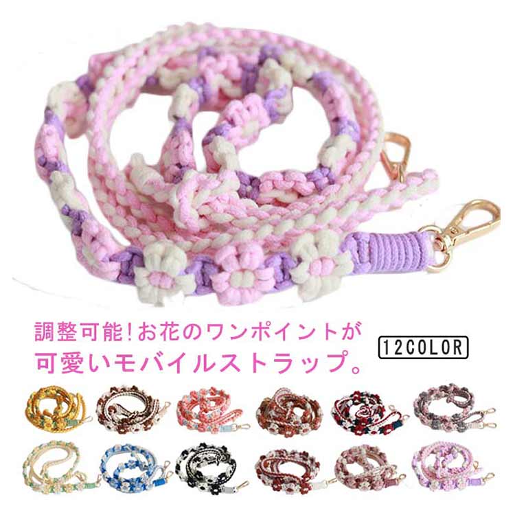 スマホストラップ 手編み 韓国風 調整可 マクラメ編み 花モチーフ 可愛い ロング 斜め掛け 携帯アクセサリー ショルダーストラップ