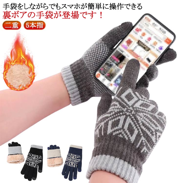 ボア手袋 ボアグローブ ニット 二重 手袋 暖かい メンズ手袋 学生 女子 高校生 ニットグローブ 雪柄 裏ボア 裏起毛 手袋