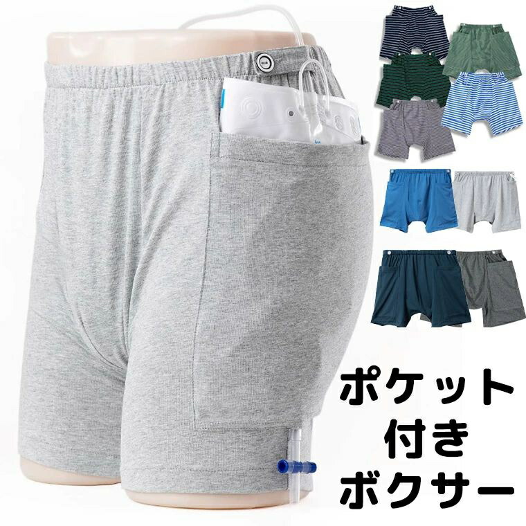 ポケット付きボクサーパンツ メンズ ポケット 両サイドポケット M L XL 2XL 3XL ドレナージバッグ ストーマ袋 無地 ボーダー シンプル 男性