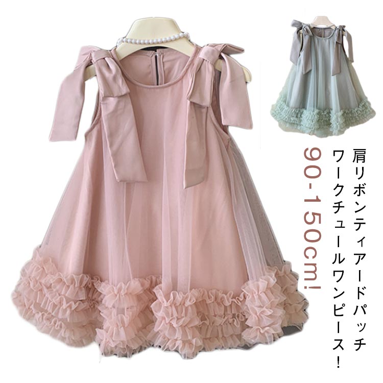 送料無料 チュールワンピース キッズ チュールドレス ティアードパッチワーク ワンピース 夏 肩リボン ノースリーブ 女の子 ガーリー こども 子供 おしゃれ