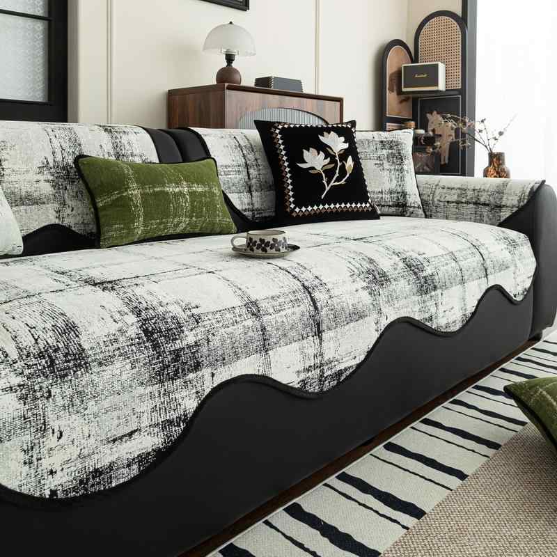 ソファーパッド チェニール 大格子柄 異形 滑り止め 一枚式 オールシーズン 直線配置 座クッション ブラック ホワイト ダークブラウン グリーン リビング 3人掛け対応 万能スタイル 無地柄
