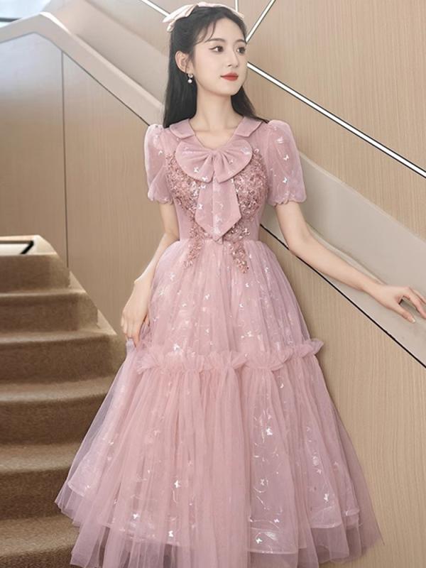 ワンピース レディース 低身長向け 夜会 パーティー 誕生日 宴会 お呼ばれ 発表会 ひざ下丈 ふくらはぎ丈 半袖 丸首 高級感 上品 優雅 韓国風