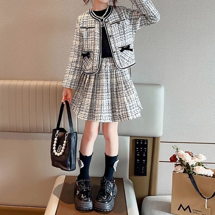 キッズ 春秋冬 スカートスーツ スカート 女の子 フロントリボン ツイード 2点セット ツーピース セットアップ ジャケット 通学