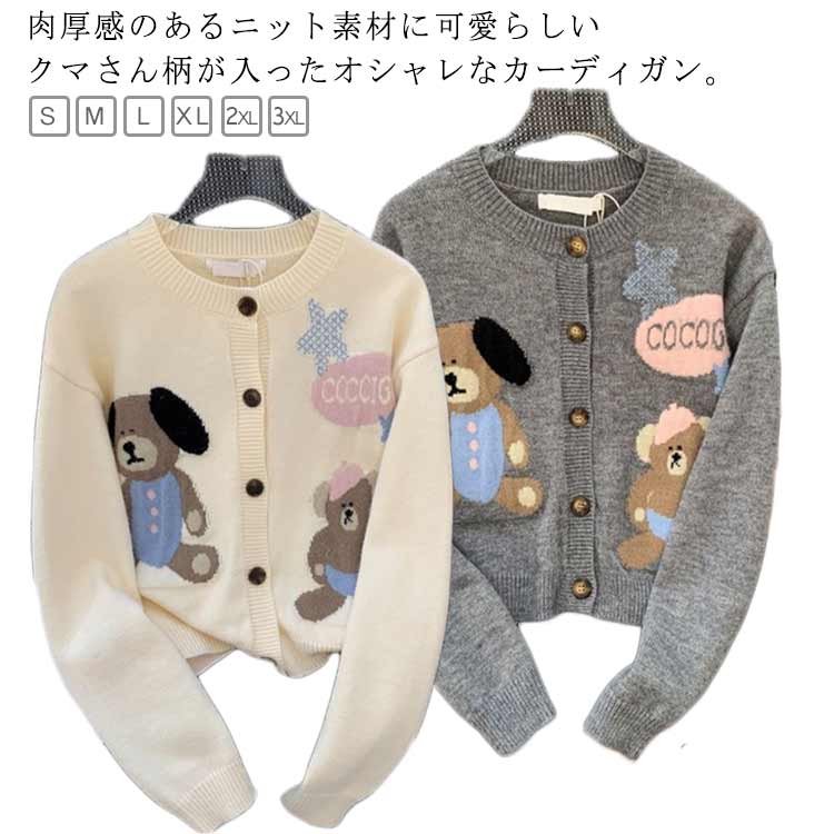 ニットカーディガン ニット カーデ トップス 熊柄 レディース 秋 冬 あったか カーディガン クルーネック クマ柄 丸首 ゆったり ショート丈 長袖 厚手 秋アウター 学生 ニットカーディガ 可愛い