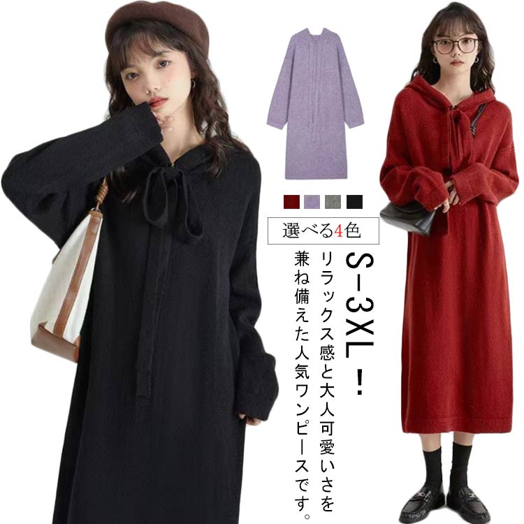 ニットワンピース ロング ロングワンピース ワンピース フード付き 膝下 長袖 厚手 ルームウェア 無地 大人 秋 冬 レディース 30代 40代 50代 セーター あったかい マキシ 防寒