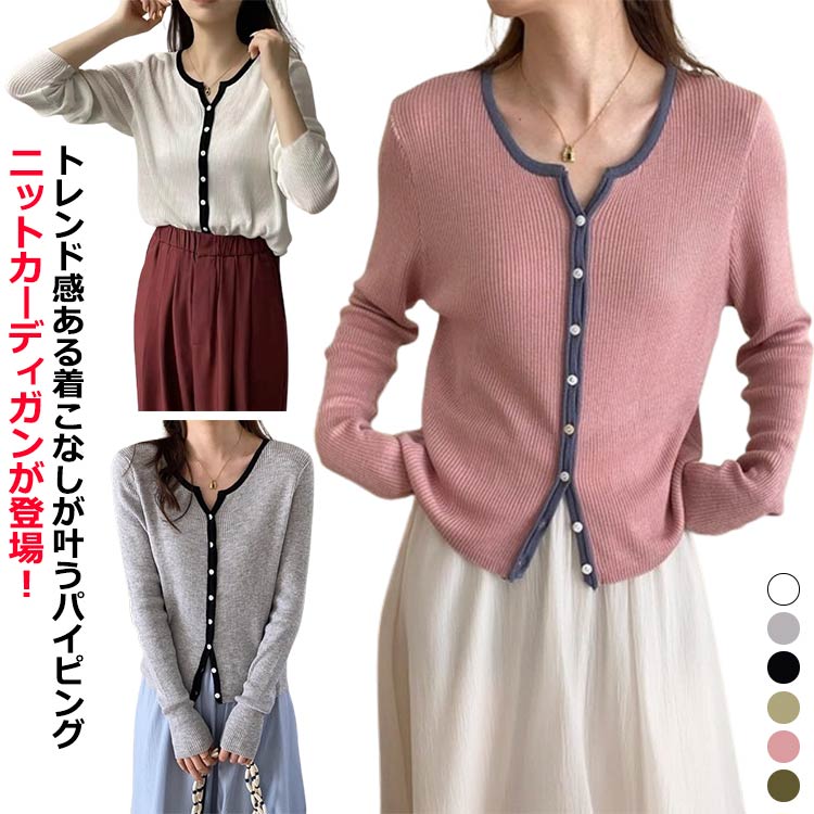 配色ニット 細見え バイカラー ニット メリハリつける配色パイピング リブニット セーター 長袖 トップス 羽織 ラウンドネック プルオーバー ニットカーディガン 薄手 スリットネック