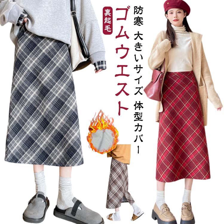 あったか タイトスカート スカート 裏起毛 秋冬 レディース 厚手 防寒 タイト ロングスカート チェック柄 体型カバー ハイウエスト チェックスカート バックスリット ゴムウエスト 通 大きいサイズ
