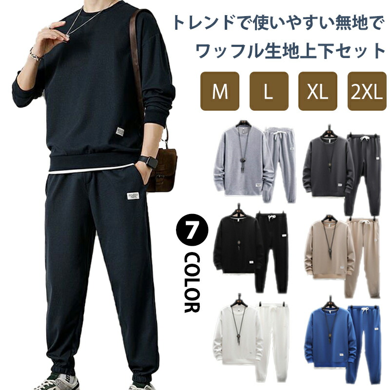 セットアップ 薄手 メンズ 2点セット 上下セット ワッフル 無地 長袖tシャツ ワッフル生地 春 トレーナー ロングパンツ 丸首 スウェットパンツ 秋 ゆったり トレーニン クルーネック