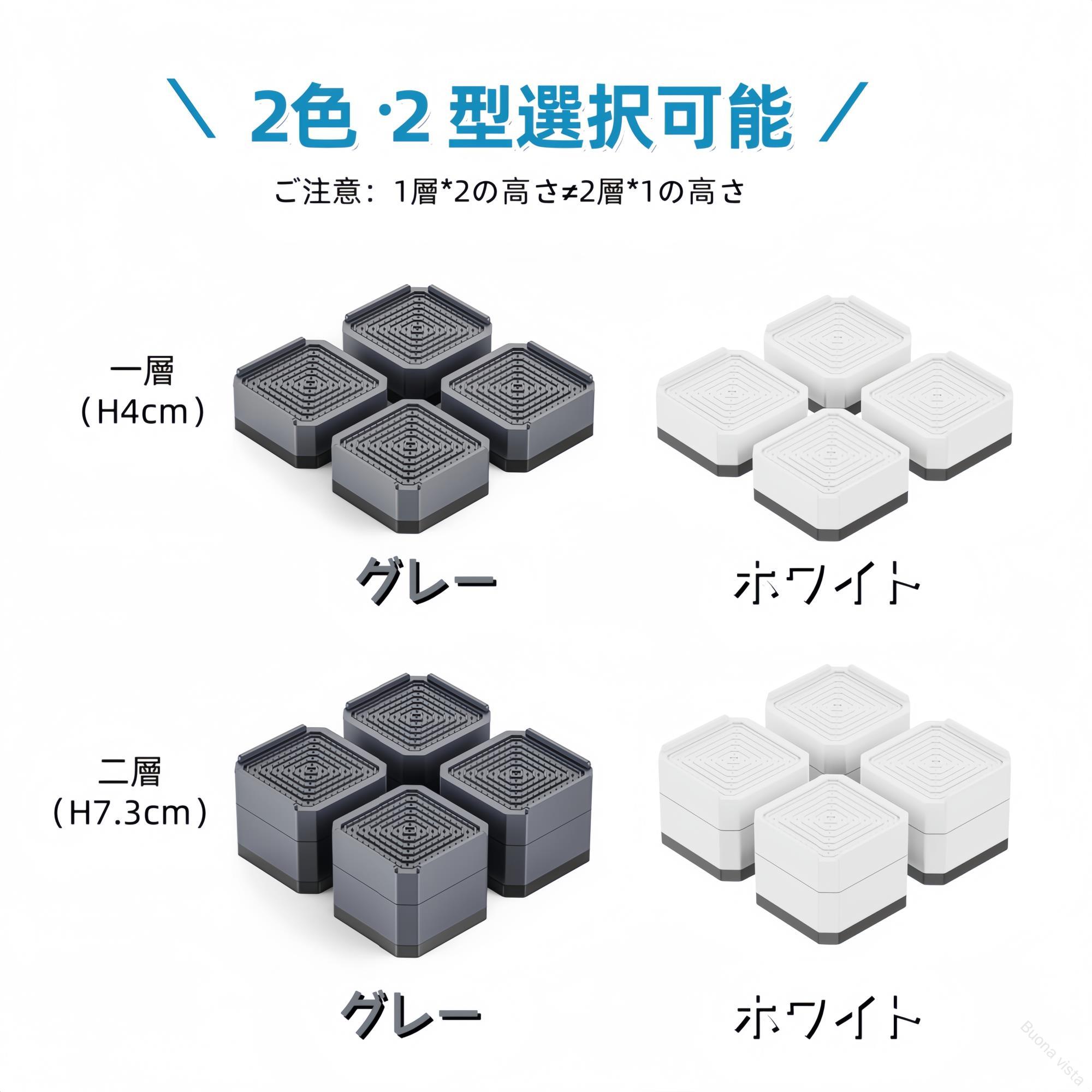 適用対象が多い!置くだけ簡単!洗濯機の振動が防げることができます。底はゴムで大気圧吸着がより強固になります。大気圧吸着で接触面が大きくなり滑り止めがしっかりします。家具の背を高めて掃除に便利。ベッド、テーブル、ソファー、デスク、キャビネットなどほとんどの家具に対応します。突き二重滑り止め設計滑り止めで周りが外れにくいです。内のグリッド構造とゴム材質は特有な防振性があるので、床に伝える洗濯機の揺れや異音をやわらげてくれます。上段と中段はPP(ポリプロピレン)の素材で、頑丈的で耐久性が抜群です。下段幅広くてしっかりしていて倒れにくいです。家電や家具をかさ上げし、モップ・クイックルワイパー・ロボット掃除機が入るのでホコリ取りには問題ないです。さらに、ベッド・ソファーを上げたら収納スペースを拡大することもできますよ。