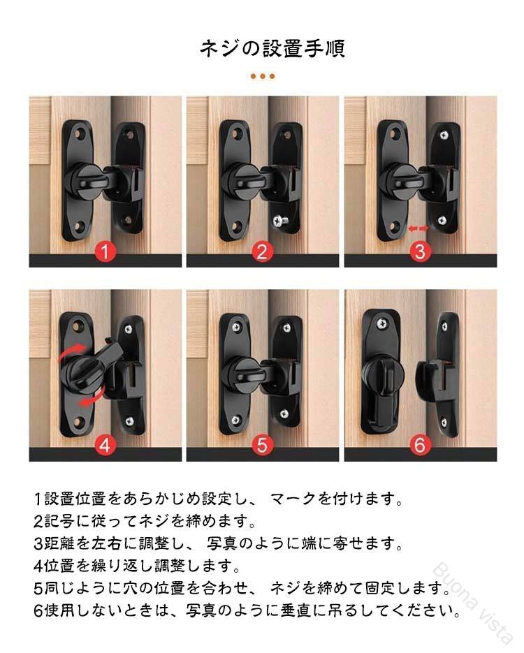 【高品質素材】高品質な亜鉛合金のドアバックルは、多層研磨仕上げで構成され、厚くて強化されたベース、強度が高く、腐食、錆や変色の心配はありません。簡単に壊れたり変形したりせず、耐久性に優れています。4球軸受構造を採用し、スムーズに回転でき、ワンタッチに簡単に開閉できます。【便利でシンプル】便利なフリップデザイン、プライバシーロック、フラップは、より快適な生活環境のためにさらなるセキュリティを提供します。【取付けも簡単】取り付け用のネジが付属しているため、留め具をすぐに設置する事ができます。左または右にインストールすることを選択できます。特殊タイプで90度の角度で取り付けられるため、ドアや窓の安全を確保するために使用できます。【安全保護】子供ケガ防止だけでなく、部屋の外に出ていかないようにしたり、様々な危険を防止できます。簡単施錠でスライドドアの防犯対策ができます。猫の脱走防止用としてもお使いいただけます。ネジの設置手順1設置位置をあらかじめ設定し、 マークを付けます。2記号に従ってネジを締めます。3距離を左右に調整し、 写真のように端に寄せます。4位置を繰り返し調整します。5同じように穴の位置を合わせ、 ネジを締めて固定します。6使用しないときは、写真のように垂直に吊るしてください。釘なし接着剤の設置手順:1設置位置をあらかじめ設定し、 マークを付けます。2台座に釘なし接着剤を塗ります。3留め具をしぼって接着し、 脱落防止の補助シールを 貼ります。4位置を繰り返し調整します。5同様に接着剤を塗ります。 (ネジは塗布しない)6補助シールを貼った後、 72時間静置します。 (冬はもっと長い)