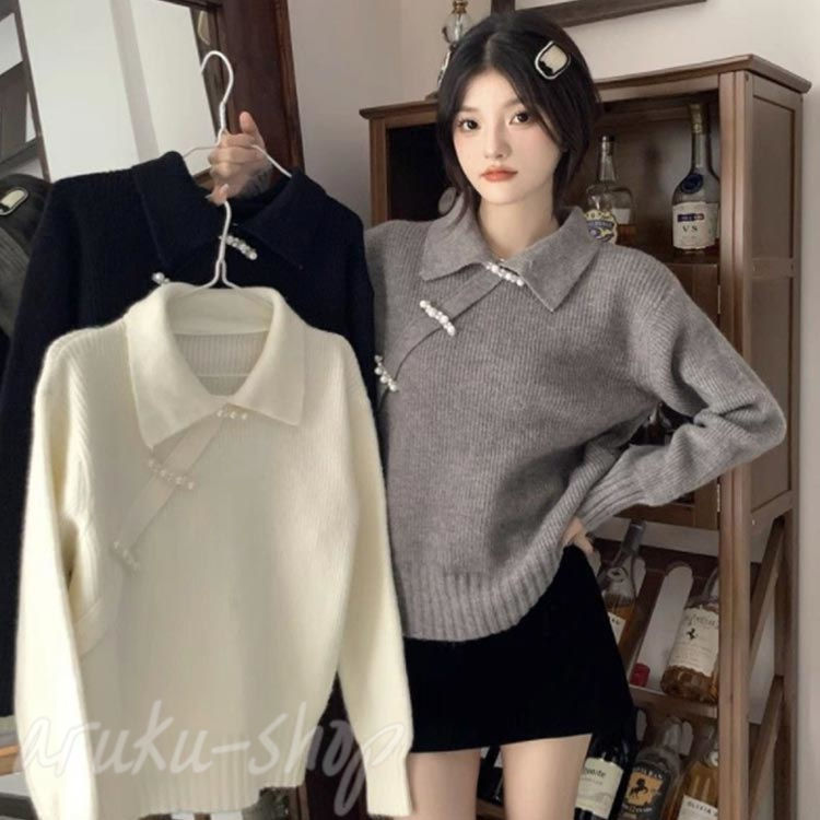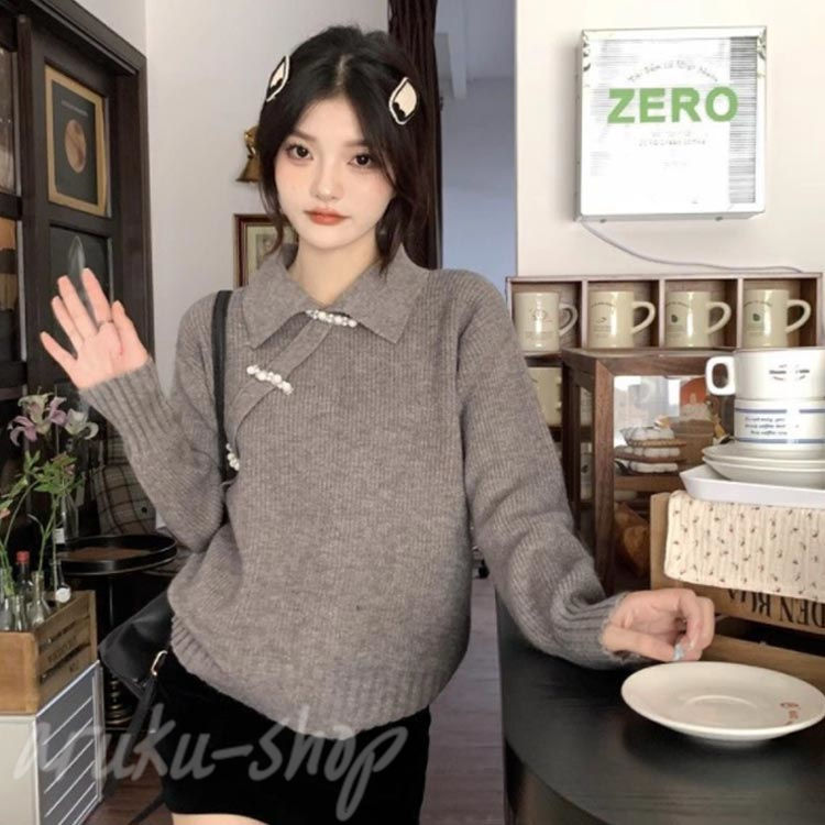 ニット 長袖 ニットトップス チャイナ レディースファッション 豊富な品揃え グレー ブラック ホワイト S M L XL 2XL