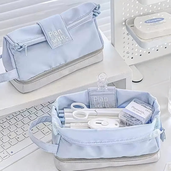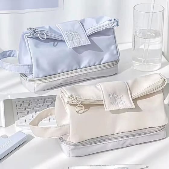 ペンケース 筆箱 シンプル 無地 おしゃれ かわいい 大容量 小学生 中学生 高校生 大学生 メイクポーチ コスメ 多機能 小物入れ 収納 持ち運び 吊り下げ 水色 濃紺 撥水 立つ 男女兼 ベージュ