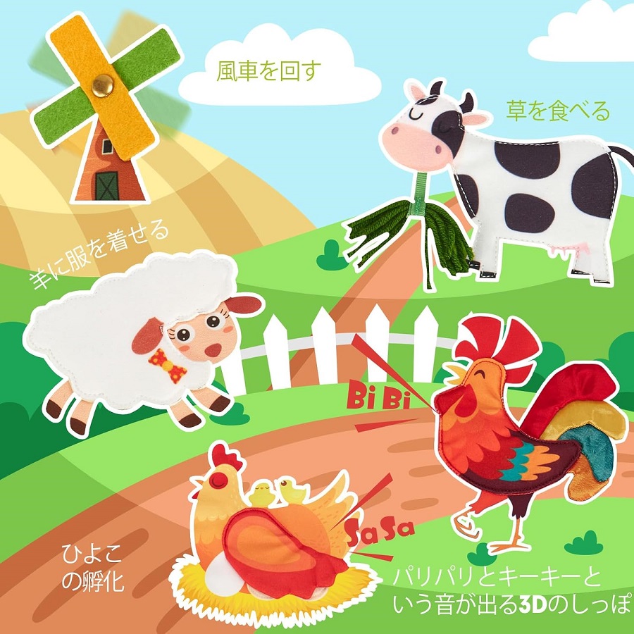 形、数字、色、農場の動物、果物、野菜、季節の変化の世界を探索します。指で操作するおもちゃ、回転する風車、牛に草を与えるなどのインタラクティブな機能により、感覚の発達と認知スキルを養います。小さな手と心を忙しくさせながら、無限の探索の楽しみのために設計されています。