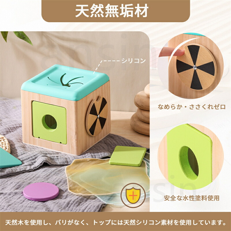 【ユニークな遊び方】このおもちゃの4つの面に、さまざまな遊び方を配置しました。赤ちゃんは鏡を通して自分の姿を見ることができます。右側には開くことのできる四角いドアがあり、ドアの後ろには木製回転盤、左側には3つのブロックに入れることのできる四角い箱があります。これにより赤ちゃんの思考力、視覚の発達、手と目の協調能力が豊かになります。