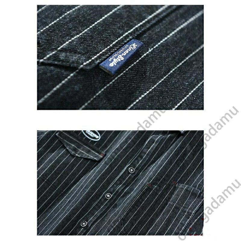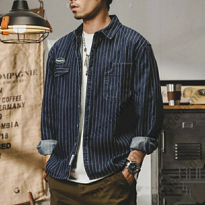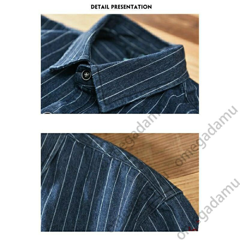 シャツ メンズ デニムシャツ メンズシャツ 長袖シャツ ストライプシャツ アメカジ 厚手 紺 秋服 柄シャツ