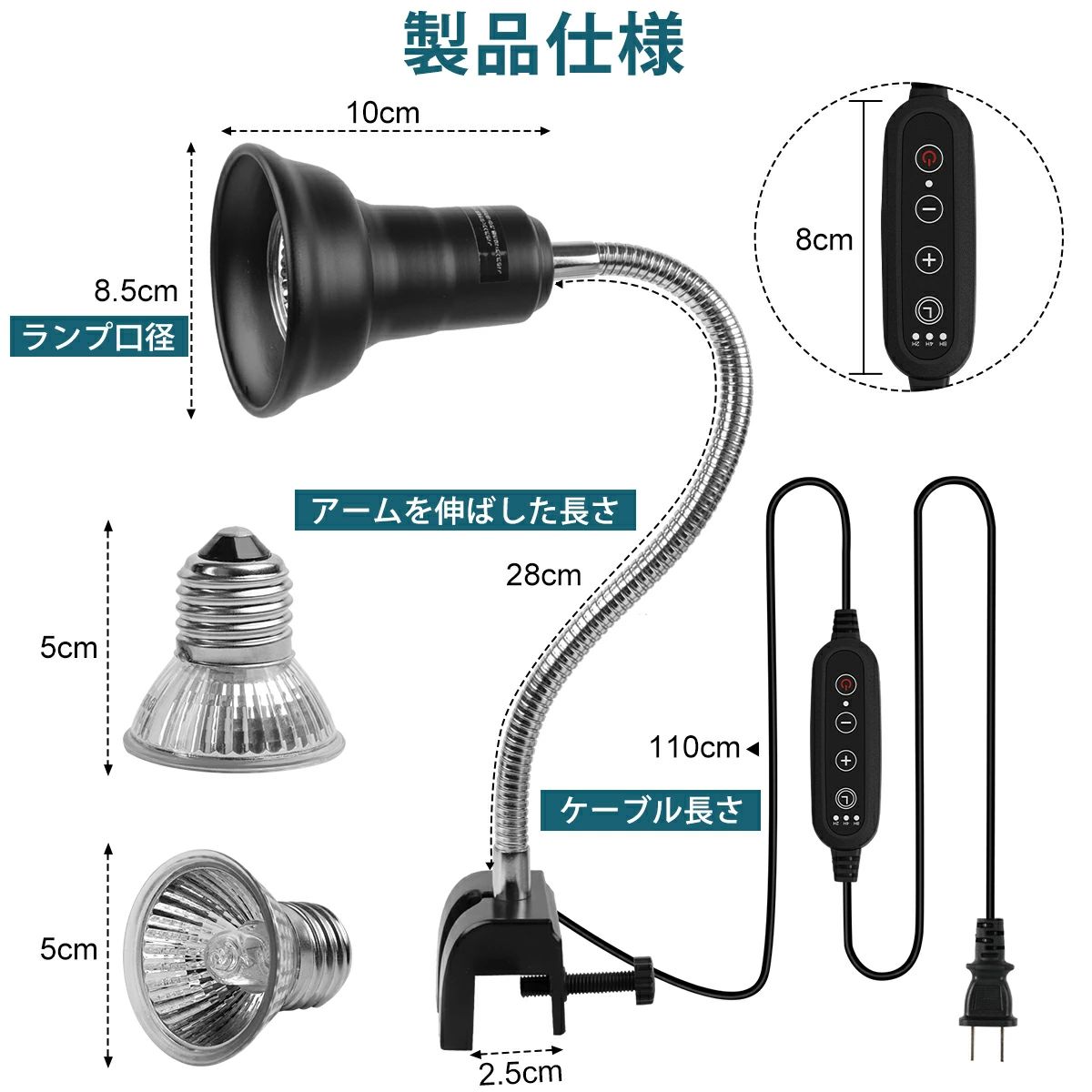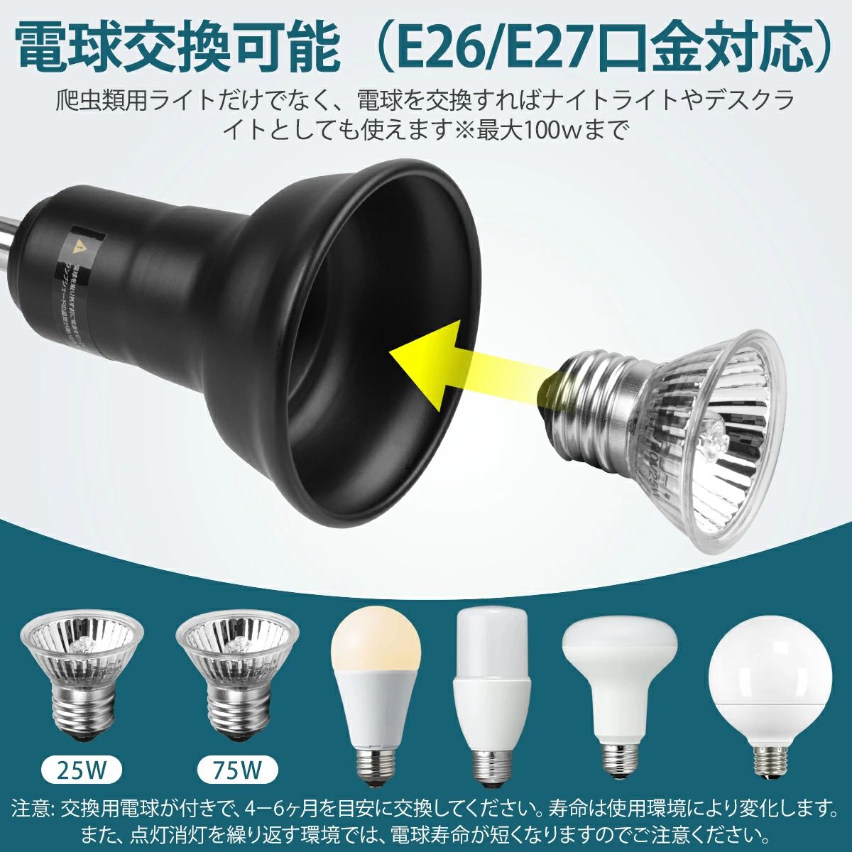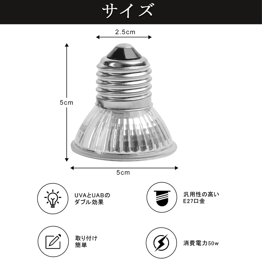 口金E27の25W/50Wの電球が付いています。4-6ヶ月を目安に交換してください。ランプ本体は、蛍光灯、白熱灯、セラミック電球、UVランプ、ハロゲンランプ、LEDなどの他の口金E27の電球に対応できます。爬虫類用ライトとしてだけでなく、ご必要によって、電球を交換すれば、ナイトライトやデスクライトとしてもお使いいただけます。