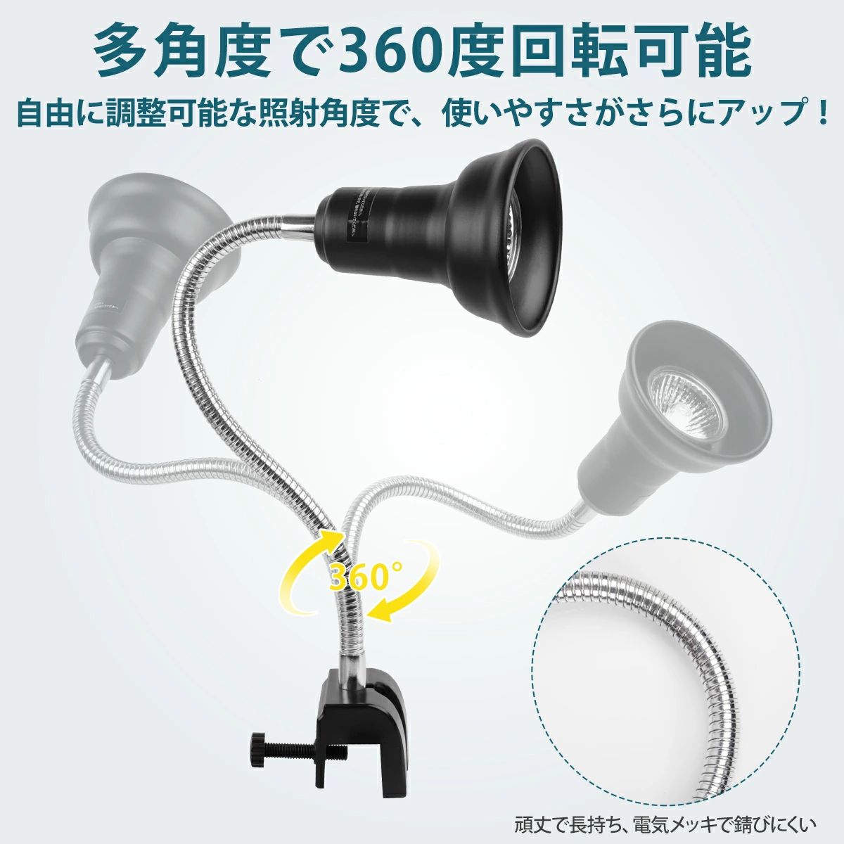 360度回転可能なライトスタンドは、光の方向や照射点の位置を自由に調整することができす。光をちゃんとペットにお届きします。