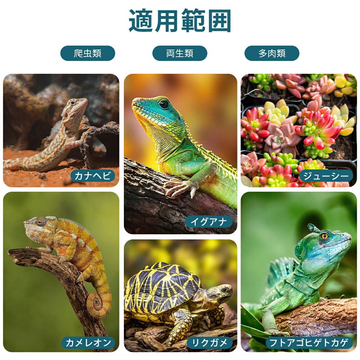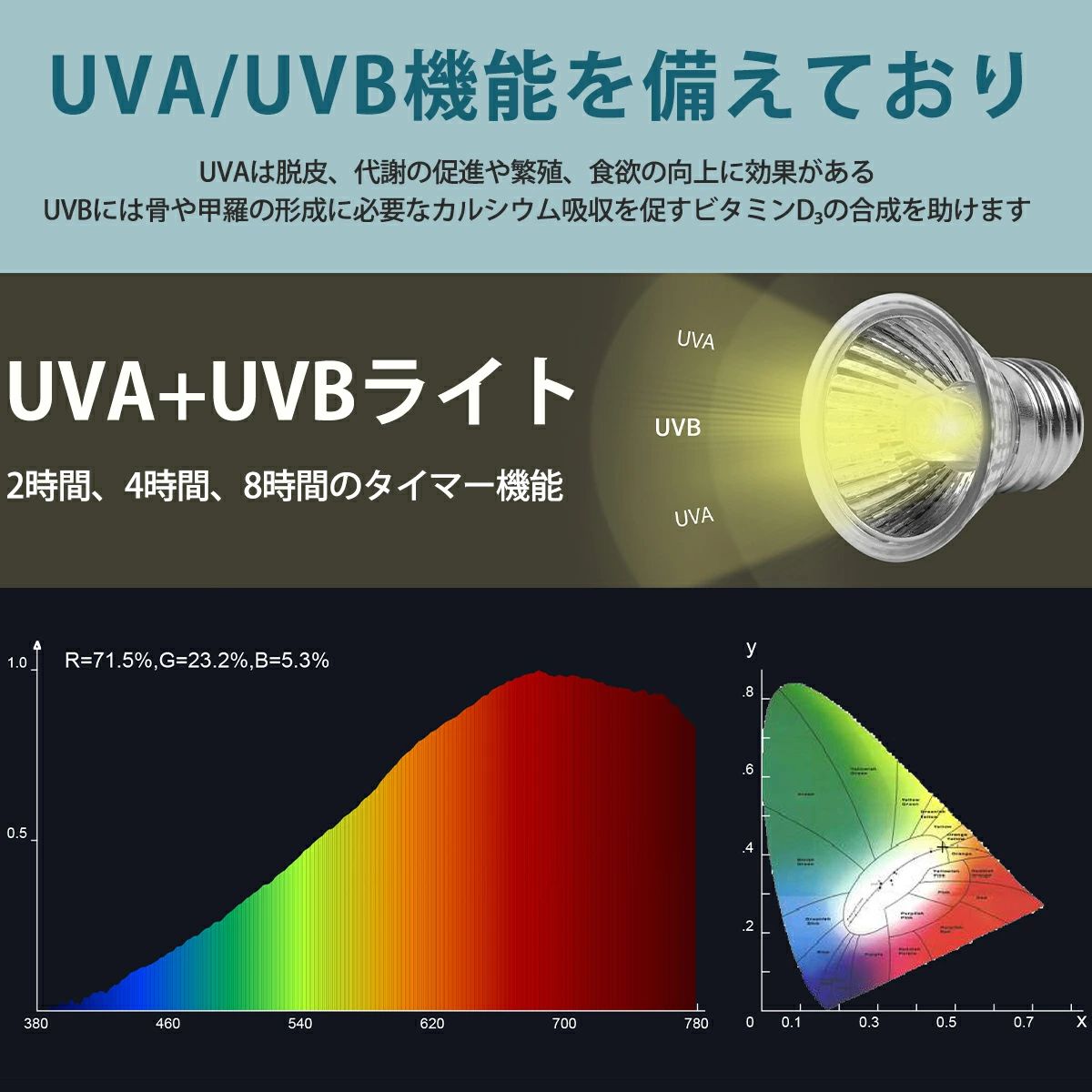 UVAは食欲増進や脱皮、生殖活動に必要とされ、UVBにはカルシウムの吸収を良くする、ビタミンDの生成を促す効果があるとされています。UVA UVBともに、生体の新陳代謝や生命維持に重要な紫外線なので、爬虫類や両生類などに最適です。