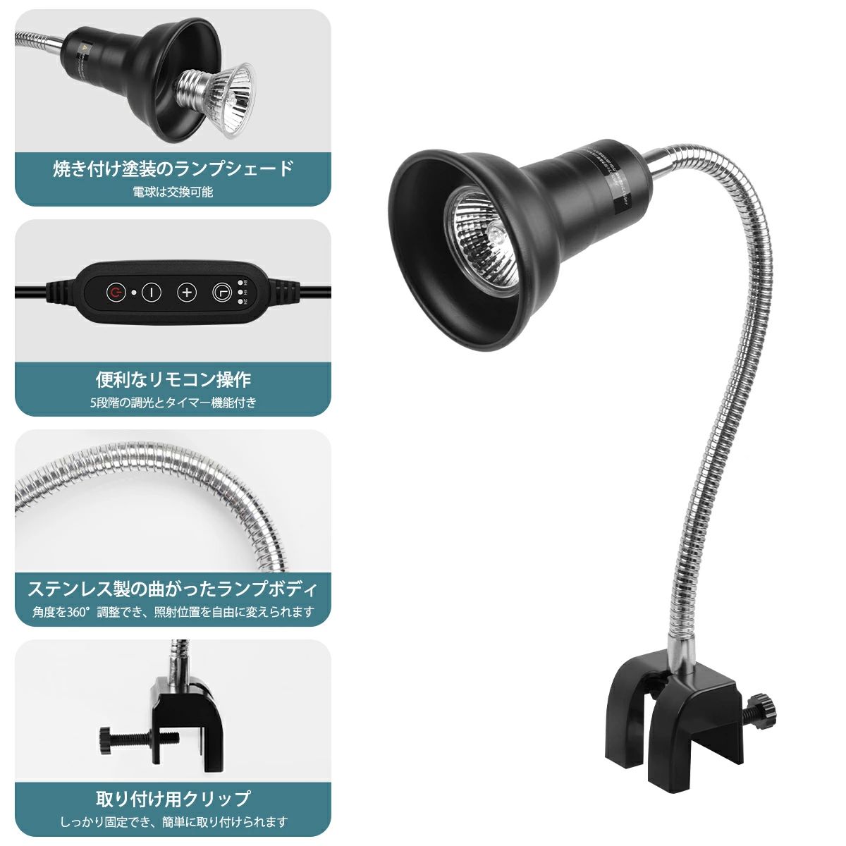 爬虫類用ライトとしてだけでなく、ご必要によって、電球を交換すれば、ナイトライトやデスクライトとしてもお使いいただけます。