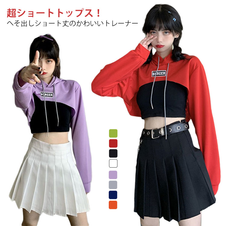 フード付き ショート丈 トップス レデ トップス スウェット トレーナー 通販 緑 白 赤 黒 紫 灰色 青 オレンジ S M L XL