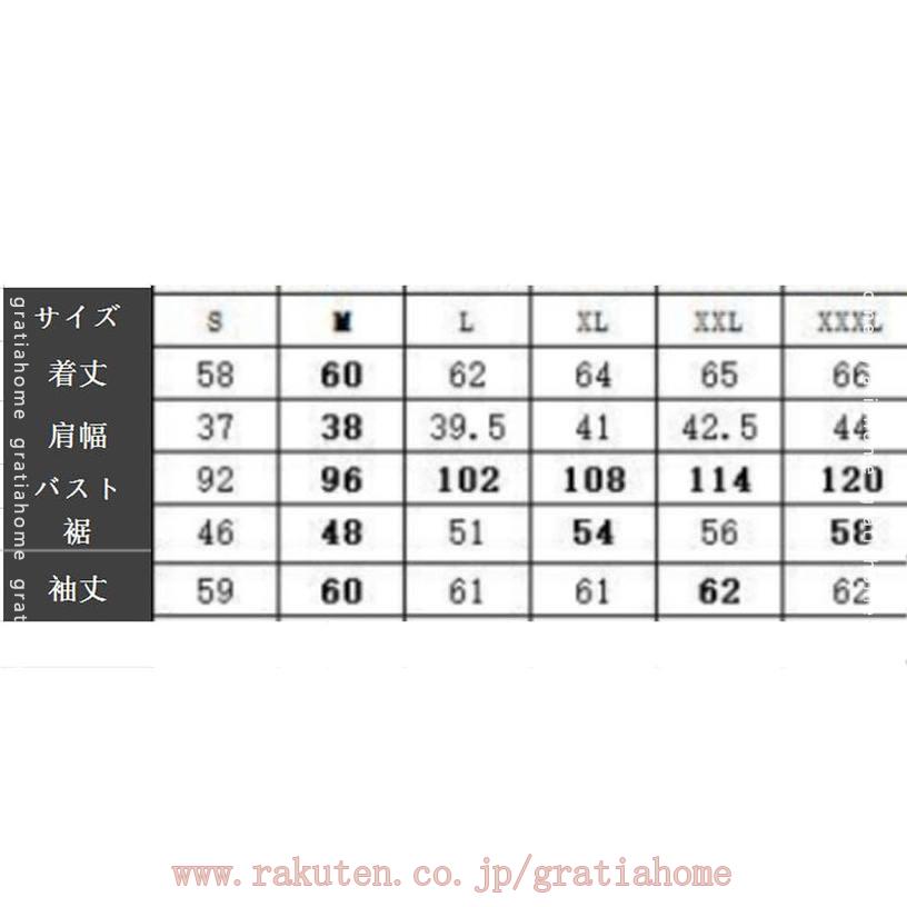 Sバスト92着丈58袖丈59 Mバスト96着丈60袖丈60 Lバスト102着丈62袖丈61 XLバスト108着丈64袖丈62 2XLバスト114着丈66袖丈63 3XLバスト120着丈68袖丈64
