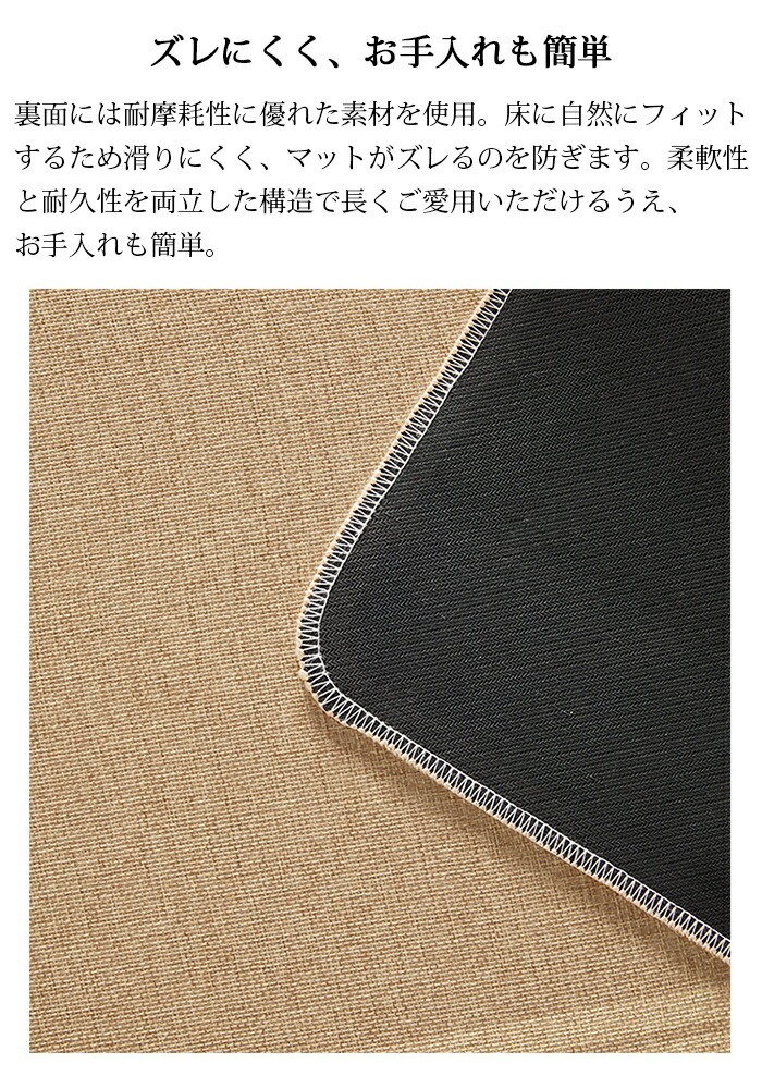 裏面には耐摩耗性に優れた素材を使用。床に自然にフィットするため滑りにくく、マットがズレるのを防ぎます。柔軟性と耐久性を両立した構造で長くご愛用いただけるうえ、お手入れも簡単。