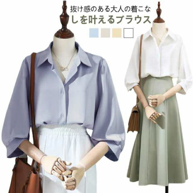 シャツ レディース ブラウス 7分袖 トップス シャツ ブラウス 続々登場 ホワイト イエロー ベージュ ブルー S M L XL 2XL 3XL