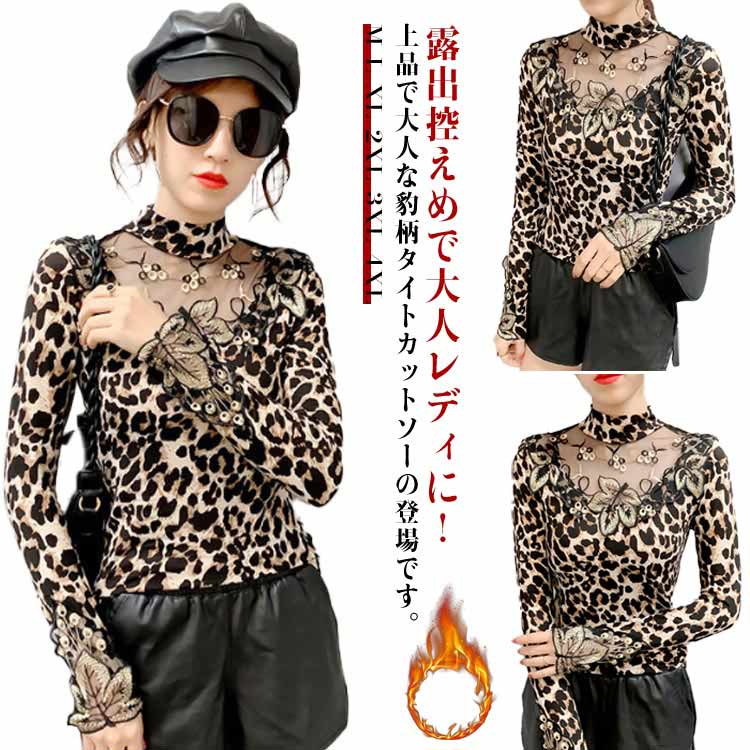 ストレッチ素材 カットソー tシャツ 無地 ヒョウ柄 トップス インナー 透け感 レディース 長袖 シースルー 大人 秋冬 タイト 豹柄