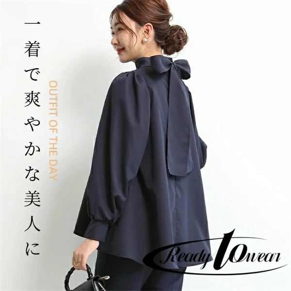 トップ おしゃれ 大人可愛い ゆったり きれいめ パフスリーブ エレガント リボン襟 バルーン袖 レディース ブラウス シャツ 長袖