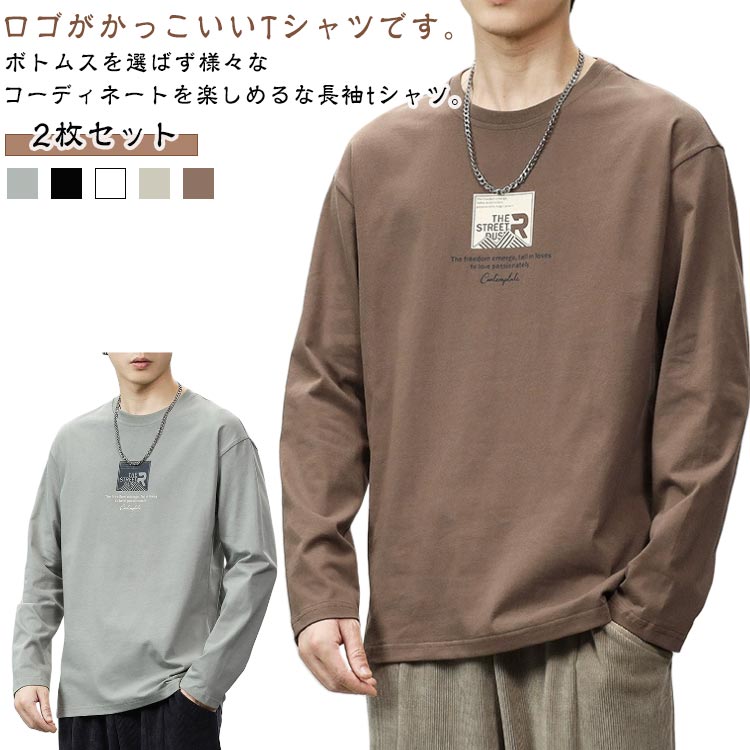 2枚セット メンズ ロングTシャツ Tシャツ 長袖 tシャツ ロンT 丸首 クルーネック トップス 春 秋 ロゴ付き シンプル ゆったり 無地 大きいサイズ ロングtシャツ インナーtシャツ