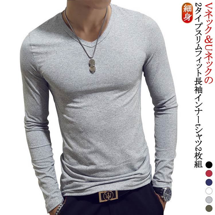 無地 丸首 Vネック 細身 長袖 Uネック メンズ 2枚セット スリム 長袖tシャツ 肌着 インナー ヒートインナー アンダーシャツ インナーシャツ ストレッチ ルームウェア 薄手 インナーtシャツ
