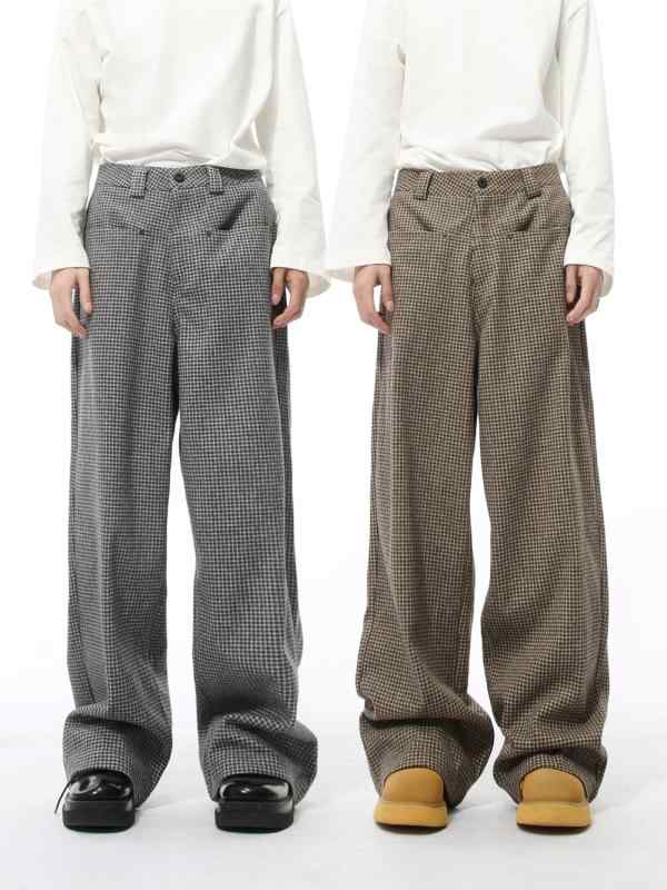 ワイドパンツ メンズ 韓国 冬 チェック柄 レトロ 立体シルエット ストレート ロング ルーズ ミッドライズ ベーシック 普段使い ポリエステル 無伸縮 黒 ブラウン レーヨン混