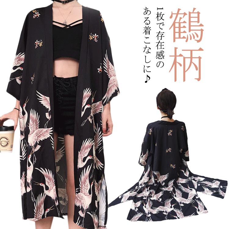 カーディガン 和柄 メンズ 7分袖 羽織物 法被 ロングカーディガン 着物 ロングシャツ レディース 春夏 日焼け対策 浴衣 祭り袢纏 花火大会 涼しい 和風 冷房対策 鶴柄 夏フェス 夏祭 モード系